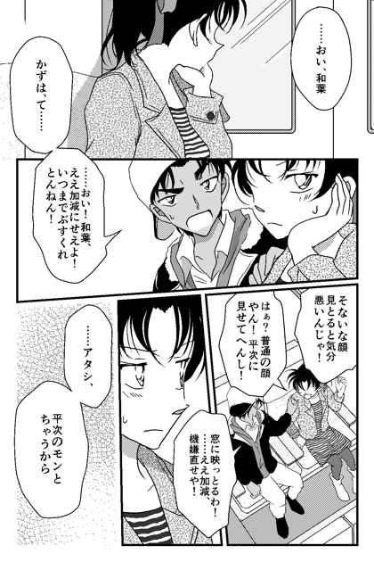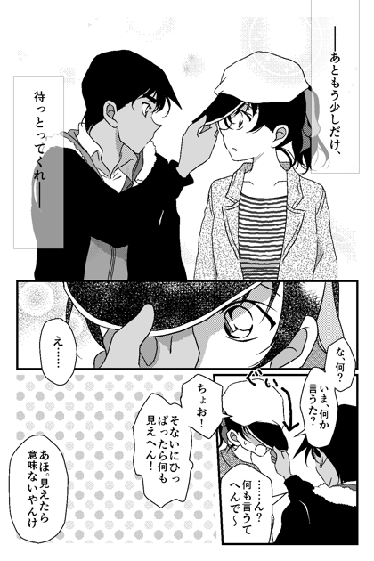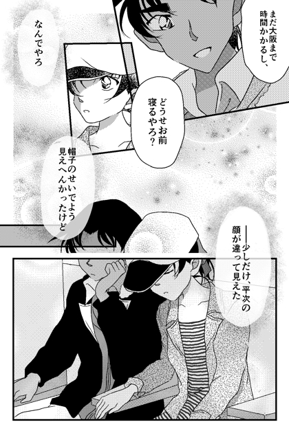 二人とも素直じゃなくてこのじれったい距離感がなんとも…♡♡♡ 平次にごまかされて素直に寝ちゃう和葉ちゃんが可愛すぎます!! 平次の帽子をこうやって被せてもらえるのってきっと和葉ちゃんだけなんだろうなぁって考えるだけでも幸せすぎて心がしんどいです笑 返信