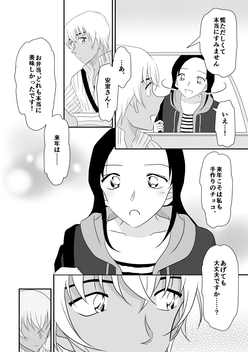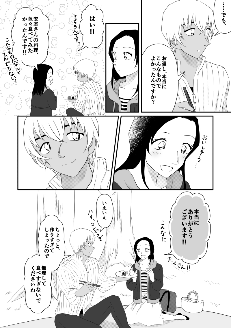 ちょっぴり頬が赤くなっているのと安室さんが屈んだときに口がきゅってなってるのが可愛らしいです…心がどきどきむずむずします!