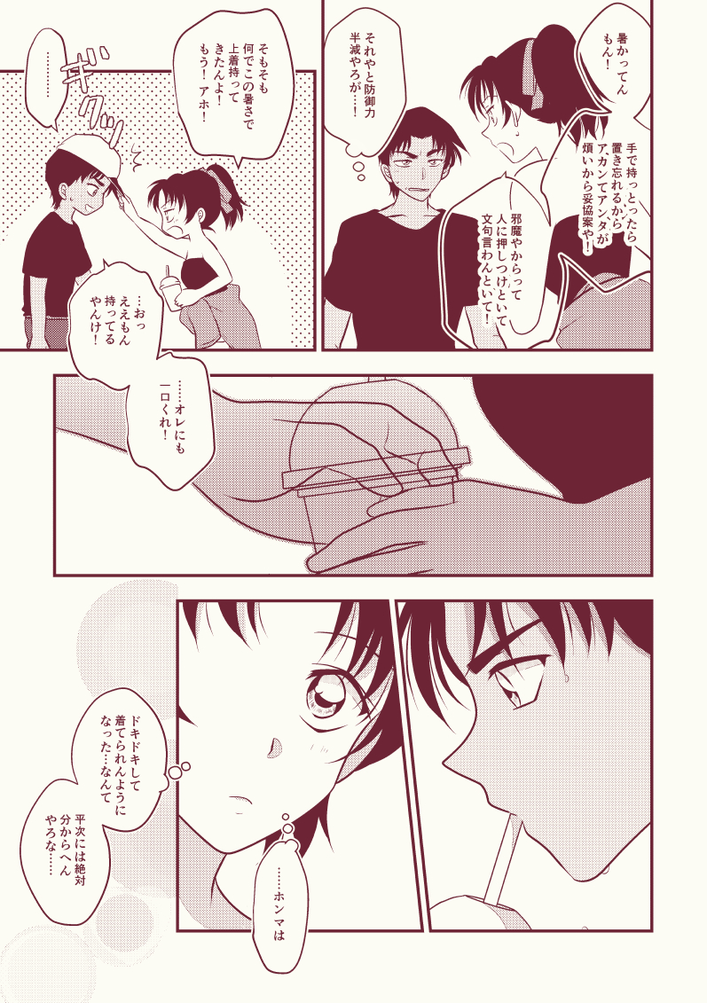 平和は間接キス余裕そうですよね・・・平次も自覚直後はちょっと意識したりするのかなぁと思いつつ、いかんせん一緒に過ごしてきた月日が長い・・・