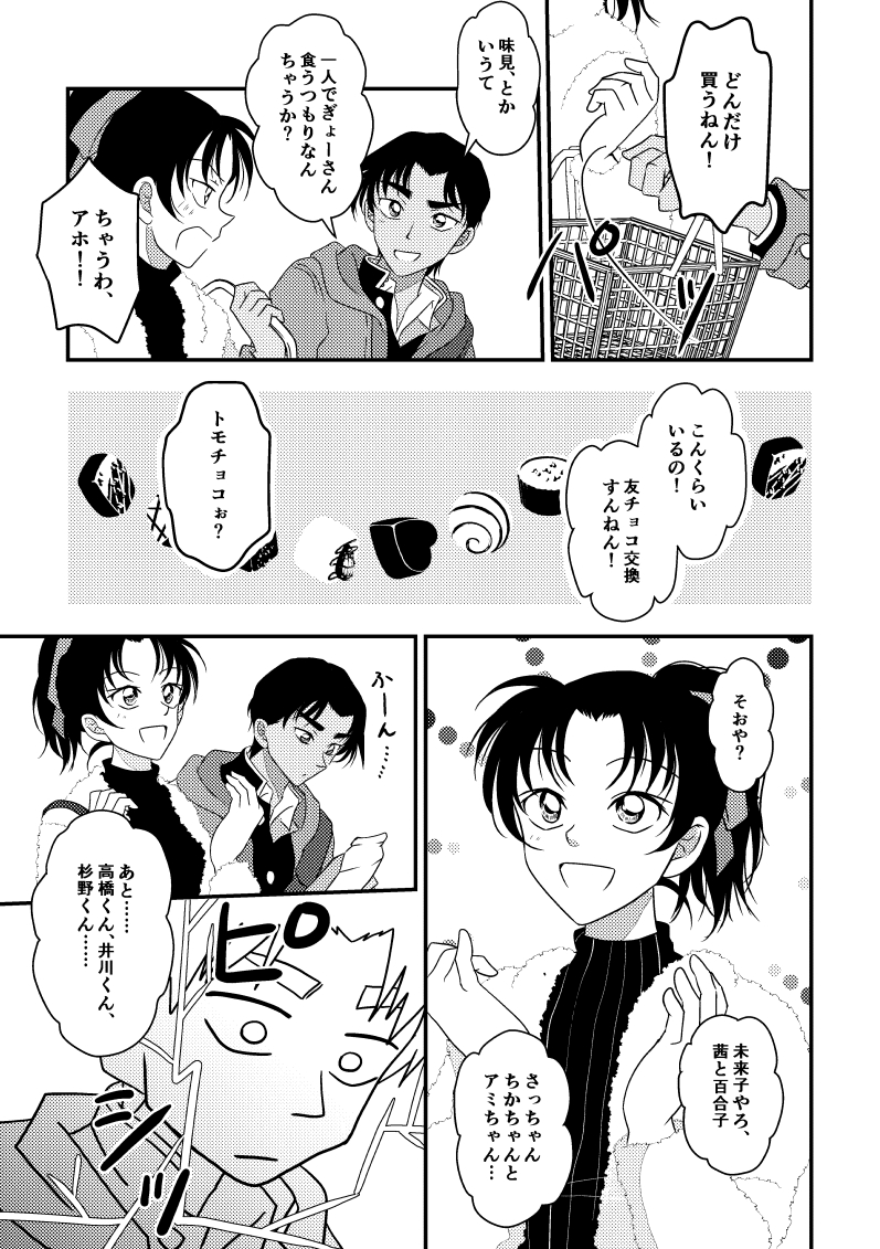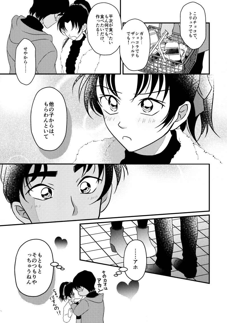 はじめまして 和葉ちゃんが一枚上手な感じとてもキュンとしました! 2人とも学校でモテるんだろうなあと 和葉ちゃんのチョコを本気で狙ってる男子多そうで平次の気持ちを考えるとにやにやします 最後の2ページの平次の表情なんか原作かと思いましたすごく作品愛が伝わってきて温かい気持ちになりました 返信